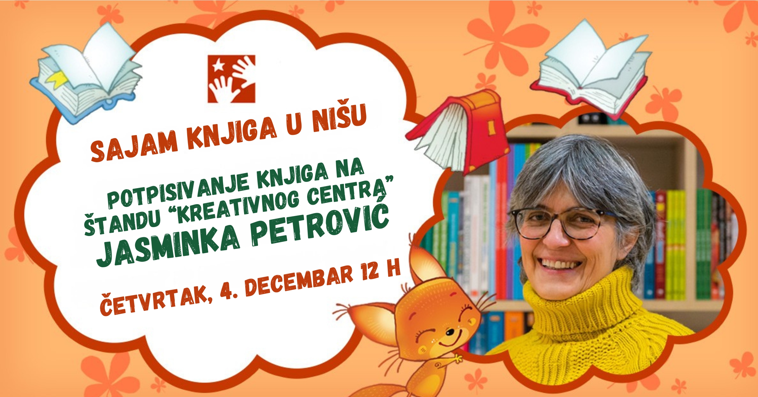 Ауторка Јасминка Петровић дружиће се са читаоцима на штанду „Креативног центра“ и потписивати своје књиге у четвртак, 4. децембра, од 12 h. даље